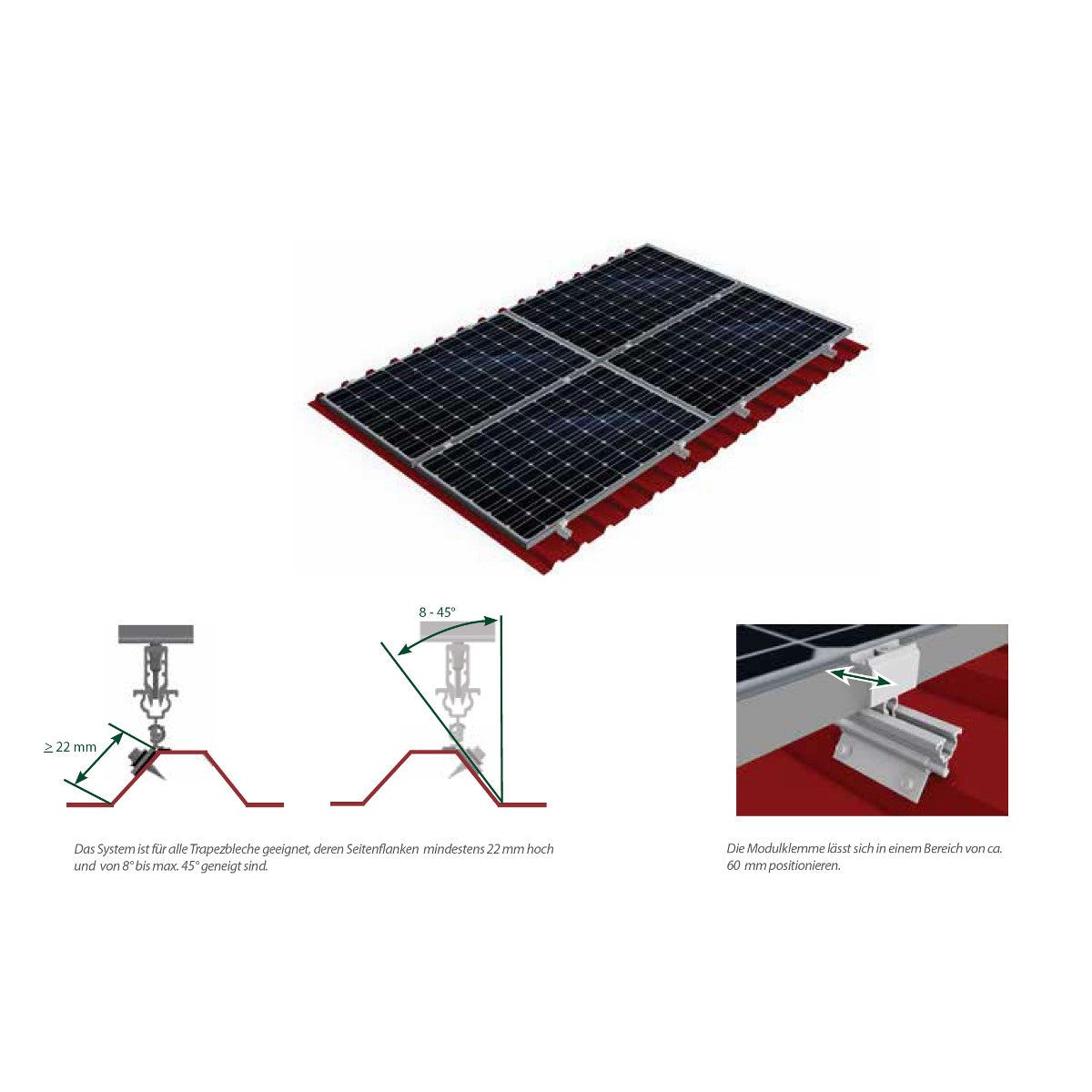 Schletter ClampFit Befestiger für Trapezblech - für Stahl- und Alublech ab 0,5 mm - die Schrauben sind nach Bedarf gesondert zu bestellen (2 Stück je ClampFit) Immer einfacher, immer kostengünstiger, immer schneller zu montieren – das sind die Eigenschaften und Vorteile, die neue Montagesysteme oder Systemteile heutzutage haben sollten. Die neue Version der Trapezblechbefestigung ClampFit - die konsequente Weiterentwicklung von ClampFit-H - ist für die horizontale Montage von Modulen auf Trapezblechdächern konzipiert und erfüllt all diese Anforderungen in beispielhafter Weise. Sie ergänzt gleichzeitig das bisherige universelle Schletter-Befestigungsprogramm und es liegt damit nur ein Artikel am Lager. Ferner ist sie mit den universellen Modulklemmen Rapid16 kombinierbar. Obwohl mit diesem Befestigungssystem bisher erreichbare €/kW-Systempreise nochmals unterboten werden, entspricht auch das System ClampFit den strengen Schletter-Qualitätsrichtlinien: Durch die Befestigung in der seitlichen Flanke wird eine optimale Krafteinleitung erreicht. So werden selbst sehr dünne Trapezbleche nicht punktuell überlastet. Auch ein Lösen der Schrauben durch thermische Dehnungen und Lastwechsel ist in dieser Befestigungsgeometrie zuverlässig ausgeschlossen. Ausführliche Produktbeschreibungen und Maße entnehmen Sie bitte dem Datenblatt und dem Gesamtkatalog unten zum Download. Bitte fragen Sie uns an! Gerne projektieren wir Ihre Photovoltaikanlage individuell und stellen Ihnen die passenden Komponenten für das Montagesystem inkl. Modulbelegungsplan zusammen.