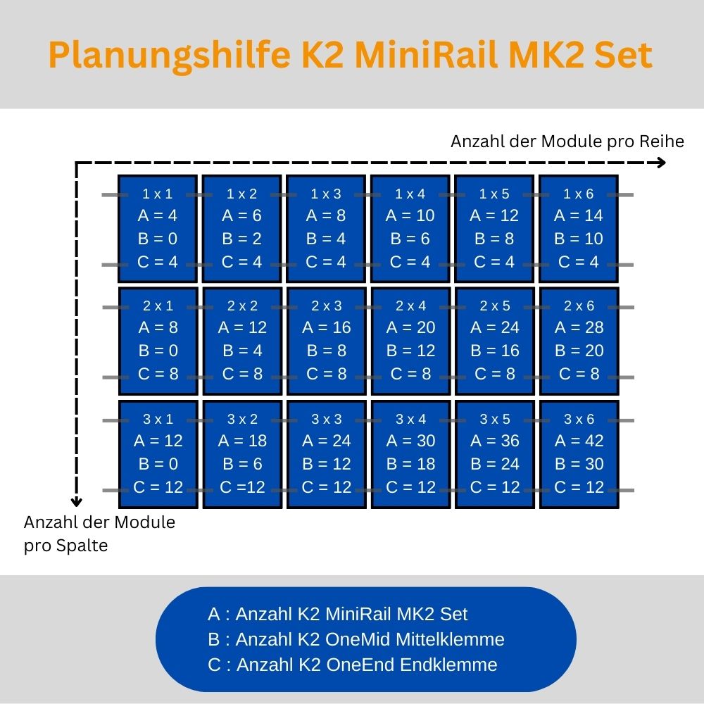 K2 Systems MiniRail MK2 Set - Einfache und schnelle Montage mit dem K2 MiniRail Montagesystem für Trapezblechdächer aus Aluminium und Stahl Kurzschiene zur Montage von Solarmodulen auf Trapezblechdächern. Inklusive Gewindeformenden Schrauben mit Dichtscheibe 6x25 mm. Material: Aluminium EN AW-6063 T66, EPDM, Edelstahl A2 einfache und extrem schnelle Montage von oben hohe Flexibilität durch höhenverstellbare Klemme modulare Bauweise ermöglicht jede Anlagengröße Einsatzbereich Schrägdach von 5° - 75° Dachneigung Voraussetzungen Dacheindeckung: Blechstärken: ≥ 0,5 mm (Stahl oder Aluminium) Sandwich-Paneele: Freigabe des Herstellers erforderlich Sickenbreite: Mindestens 22 mm * Hochsickenabstand: 101 - 350 mm abhängig von Sickenbreite Ebene Auflage um das Bohrloch: Ø ≥ 20 mm Rahmenhöhe Module: 30 - 50 mm PV-Module für alle gängigen Modultypen geeignet Modulausrichtung vertikal oder horizontal Material Aluminium (EN AW-6063 T66/ EN AW-6082 T6); EPDM Verbindungselemente Edelstahl A2-70, EPDM Verschraubung mit Bohrschrauben oder Gewindeformschrauben mit bauaufsichtlicher Zulassung Lieferumfang: 1x Kurzschiene zur Montage von Solarmodulen auf Trapezblechdächern, inkl. 4 Dünnblechschrauben mit Dichtscheibe Maße: 385 x 85,4 x 31,4 mm Material: Aluminium (EN AW 6063 T66), EPDM Ausführliche Produktbeschreibungen und Maße entnehmen Sie bitte dem Datenblatt und dem Gesamtkatalog unten zum Download. Bitte fragen Sie uns an! Gerne projektieren wir Ihre Photovoltaikanlage individuell und stellen Ihnen die passenden Komponenten für das Montagesystem inkl. Modulbelegungsplan zusammen.